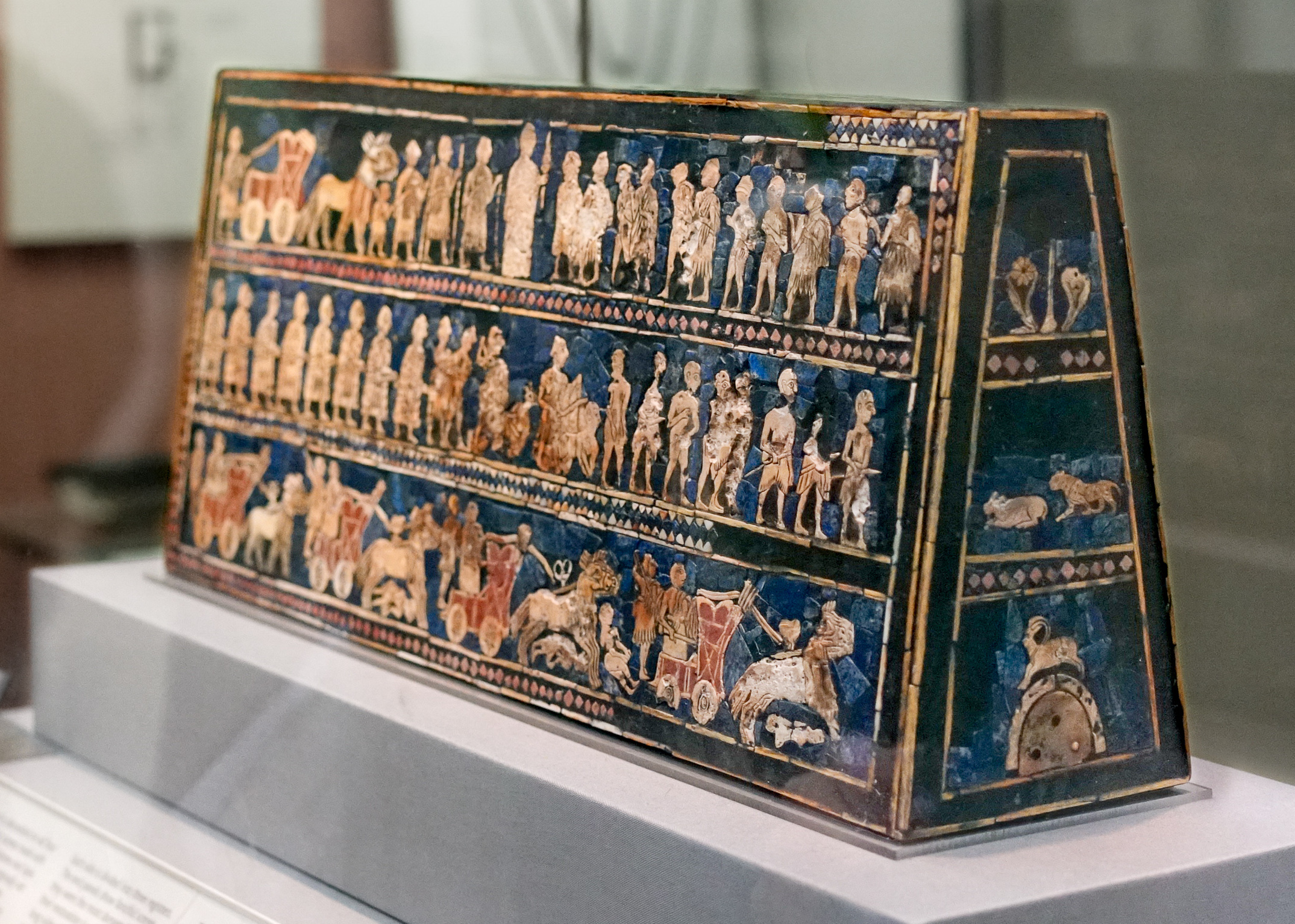 수메르의 예술은 실용적이면서도 정교했습니다. 현존하는 수메르 예술품 중 가장 유명한 것 중 하나가 《우르의 스탠다드(Standard of Ur)》입니다. 기원전 2600년경의 작품으로, 나무 상자의 네 면에 조개껍데기·청금석·붉은 석회석을 모자이크처럼 박아 만든 이 유물은 전쟁과 평화의 두 장면을 묘사합니다. 한 면에는 전투 장면, 다른 면에는 축제와 연회 장면. 작은 인물들이 줄지어 행진하고, 마차가 달리고, 포로들이 끌려가는 이 장면들은 3,000년 후의 이야기를 전하는 만화경 같습니다.